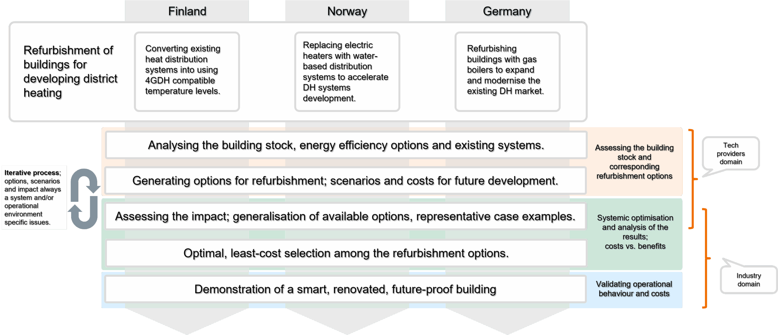 This project aims to 1) identify, 2) assess and 3) demonstrate the solutions for refurbishing buildings to accelerate the decarbonization of the heating sector while increasing energy system flexibility. The focus is on heat supply through next generation, low-temperature DH, but the project outcomes will similarly improve the efficiency of virtually any heat supply, e.g., individual ground source HPs. Furthermore, while the emphasis is on existing building stock, the solutions are fully applicable to new buildings. The project combines three very different operational environments and perspectives for solving the same challenge as shown in Figure 1.